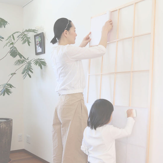 必要な分だけ、欲しい色だけ 美濃判障子紙を1枚(1段分)からお求めいただけます。補修に、アレンジに、空間にさりげない彩りを。必要な分だけ、色を選んでお使いください。 藍染め×機能性障子紙 藍の生葉を発酵・沈殿してできた顔料である藍錠(あいじょう)を使って職人が1枚1枚の手仕事で日本の伝統色である【藍白(あいじろ)】に染めた機能性障子紙です。藍錠だけでなくベンガラと掛け合わせることでより落ち着いた色合いを表現しております。自然からつくられた奥深い色合いをお楽しみください。 【ご購入前にご確認ください】・障子紙のサイズが美濃判サイズ(約28.2×97cm耳付き)となっております。事前にご自宅の障子戸のサイズをご確認ください。サイズの測り方はこちらから・自然顔料を用いた手染め加工により、商品ごとに色味や質感に若干の差異がございます。ご注文の際はあらかじめご了承くださいますようお願い申し上げます。※耳の部分には染めた紙を干した際についたピンチ跡(約1cm)がありますが、弊社通常販売サイズ94㎝より3㎝長い仕様となっております。 ≪藍染の特徴≫・自然由来ならではの奥深く味わいのある色彩。 染料インクよりも色持ちが良く、深みのある藍色を長く楽しめます。 ※自然光のもとではゆっくりと表情を変えていきます。 ≪機能性和紙の特徴≫・貼りやすい :コシがあって程よい厚みがあるので 貼りやすい 仕上がりが美しい。・強度が約4倍:複数の新聞紙一枚当たりの 破裂強度平均77kPa (当社調べ) 当商品は約4倍の355kPa※1 ・優れた遮光性:遮光率約90%(白)※2 UVカット96%(白)※3・省エネ効果 :断熱効果率32%(白)※4 ※1 JIS P 8112:2008 紙破裂強さ試験方法 ※2 JIS L 1055:2009 カーテンの遮光性試験方法 ※3 JIS L 1925 7a 紫外線遮蔽率試験 ※4 断熱性試験(赤外ランプ60℃法) 障子戸を寝かさず立ったまま1人で簡単に貼ることができます。紙にコシがあり強度もあるので非常に貼りやすい紙となっております。障子の貼り方は、こちらのページをご覧ください。 ・サイズ :美濃判サイズ(約28.2cm×97cm) ※障子枠は付いていません・内容量 :1枚入り障子戸1段分 紙管 1本・種類 :藍染 藍白色・材質質...